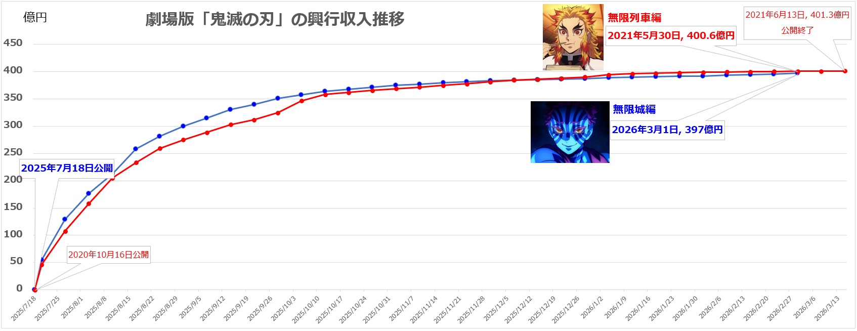 [無限城編-無限列車編 比較グラフ]劇場版「鬼滅の刃」興行収入推移[2026年最新]