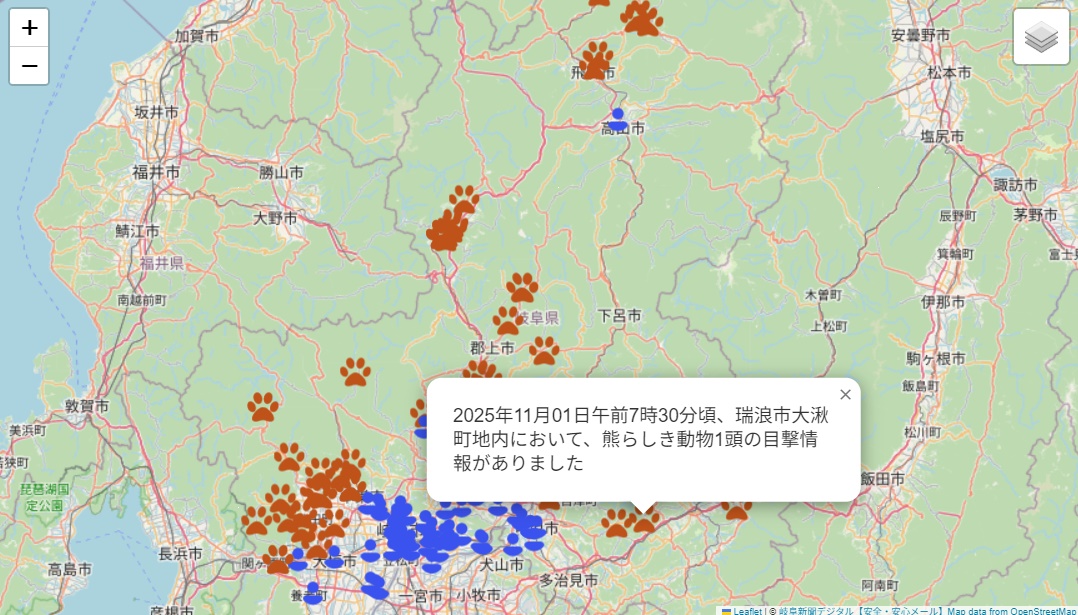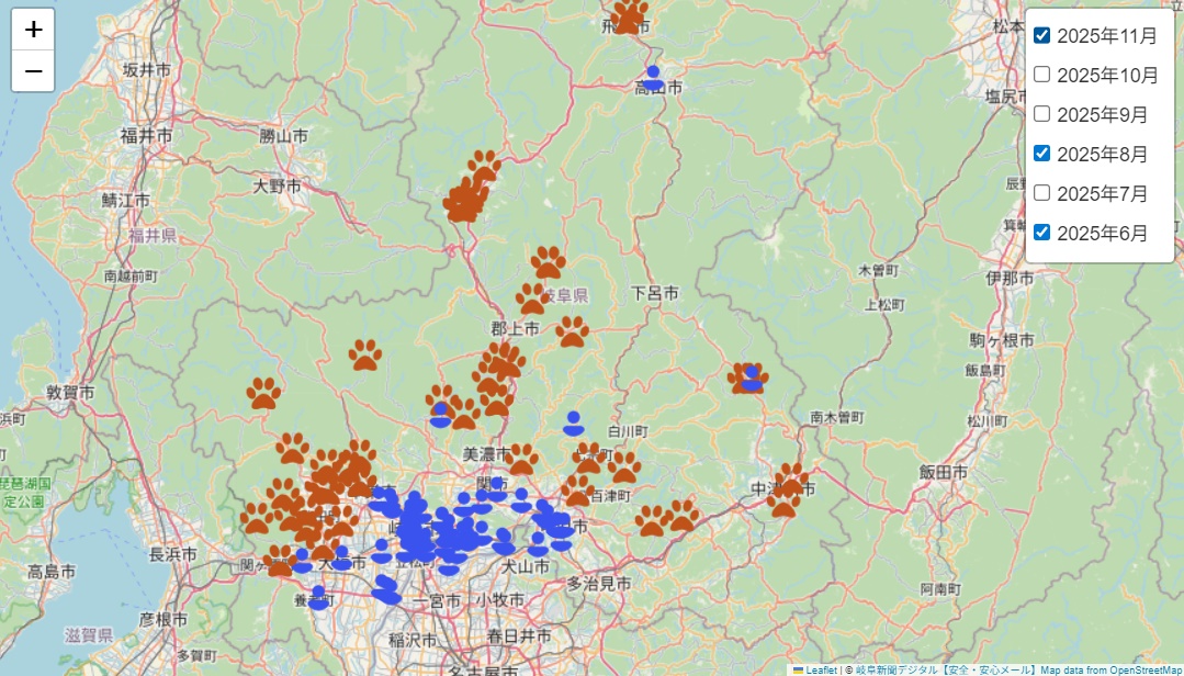 その中でも、岐阜県のクマ目撃マップが、