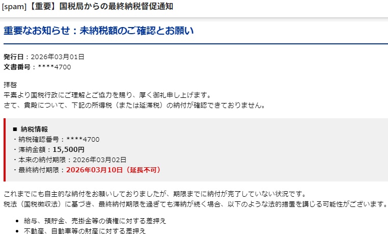 【注意】【重要】国税局からの最終納税督促通知 は本物?[e-Tax]