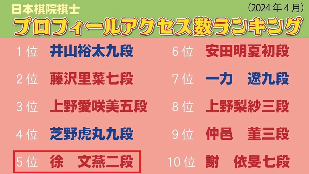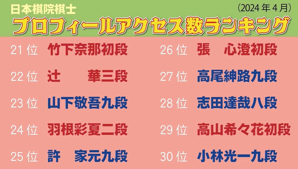 日本棋院棋士プロフィールアクセス数ランキング