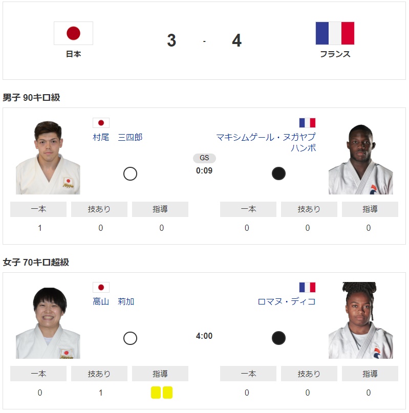 パリ五輪・柔道混合団体・決勝、日本3-4フランス