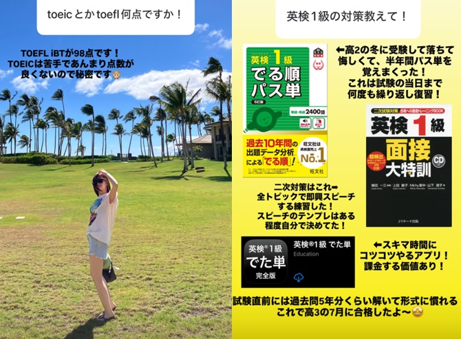 2019年にアメリカ留学を経験し、帰国後は英検一級を取得。